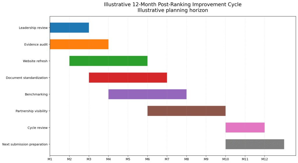 The fourth step is rhythm. Universities should turn the ranking response into a 12-month cycle with milestones, not a burst of activity before the next edition. Quarterly reviews, evidence updates, web audits, communication improvements, and periodic benchmarking can make a dramatic difference. Institutions rise when they replace episodic effort with routine discipline.