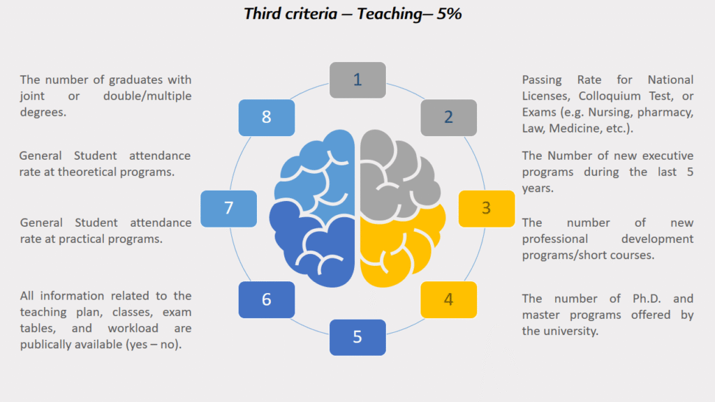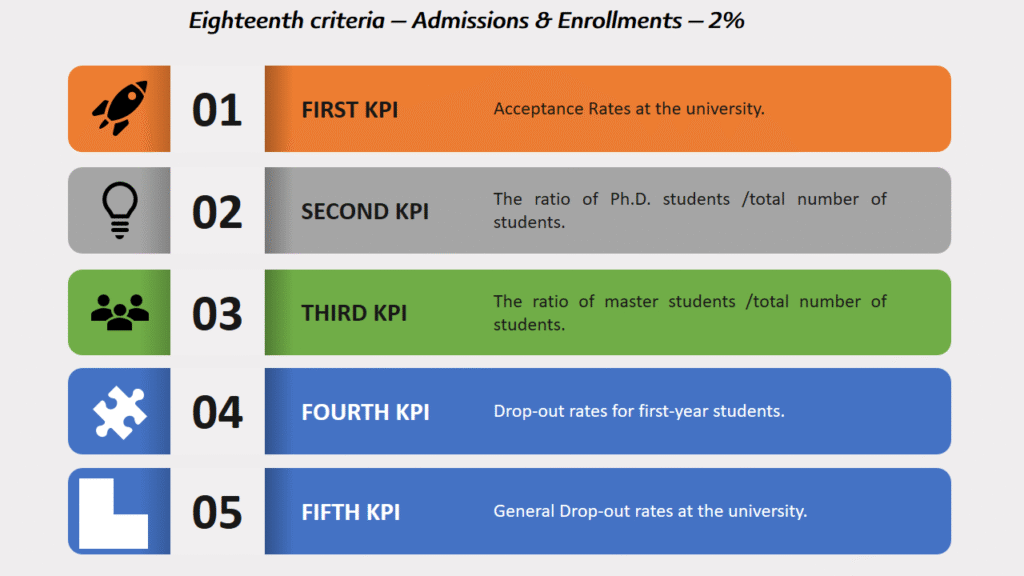 The university that gets more points is the university that gets a higher ranking. For this reason, the ranking is based on measuring the university’s level of performance at all levels according to 25 criteria and 177 performance indicators, and thus, ensures the development and improvement of the university and its achievement of added value.