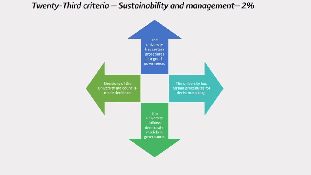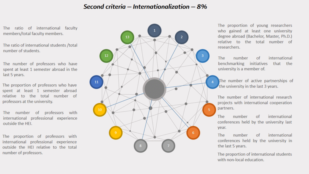 Each of the 25 criteria gets its own percentage. The total percentage is 100%. The percentage is multiplied by 100, and the general result is 10,000 points. Each criterion and performance indicator gets a specific number of points, and the total value of points obtained by higher education institutions is collected.
