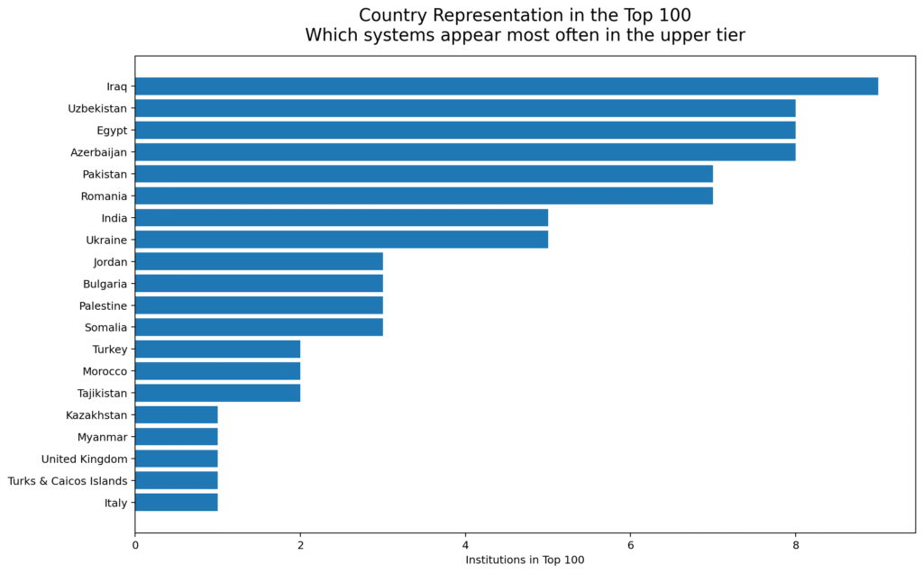 The upper part of the table alone makes this point powerfully. We see strong institutions from Uzbekistan, Kazakhstan, Azerbaijan, the Turks and Caicos Islands, Jordan, Myanmar, Iraq, Palestine, and Bosnia and Herzegovina, among others. These appearances are not tokenistic. They are competitive. They show that institutional capability exists far beyond the usual centers of recognition. Once that becomes publicly visible, the global conversation becomes more honest.