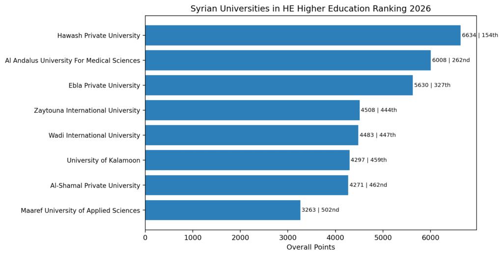 Figure 1. Overall points and global ranking positions of Syrian universities in the 2026 edition.