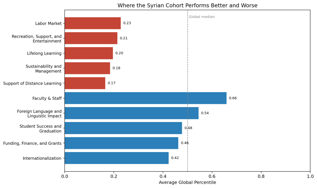 The middle of the profile is more mixed. Student Success and Graduation is not a standout strength, but it is close to the global middle, which means several Syrian institutions are managing completion and progression more credibly than their overall ranks might imply. Funding, Finance, and Grants also offers some promise, although this strength is uneven and concentrated in a smaller number of universities. Internationalization appears similarly uneven: it exists, but it is not yet strong enough across the whole cohort to alter the collective picture.