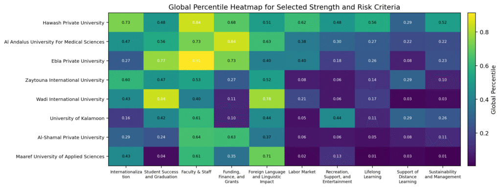 Figure 3. Global percentile heatmap for selected strength and risk criteria across Syrian universities.